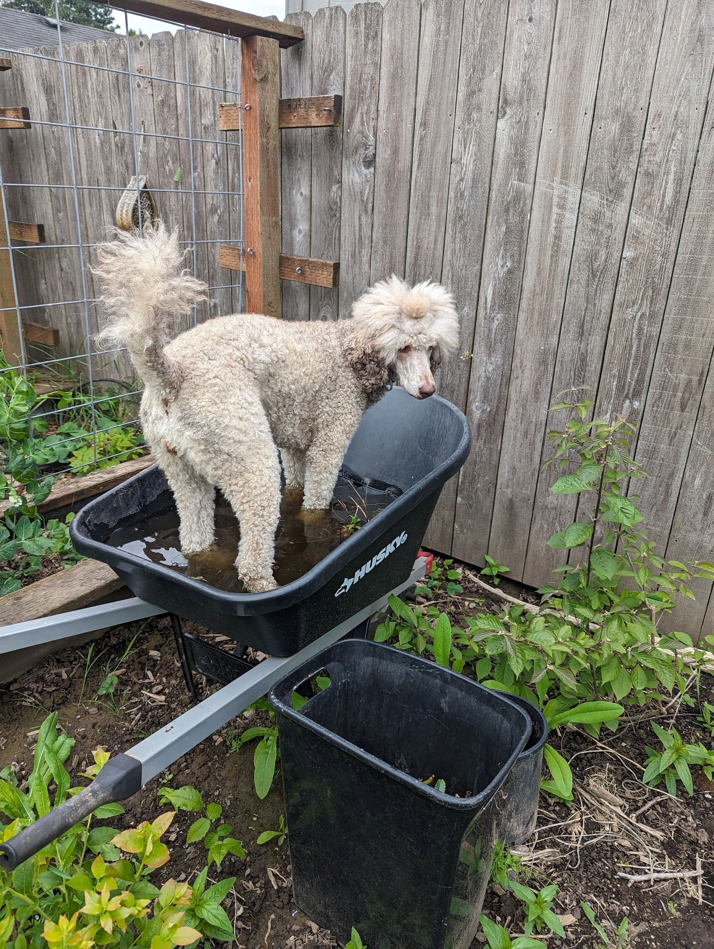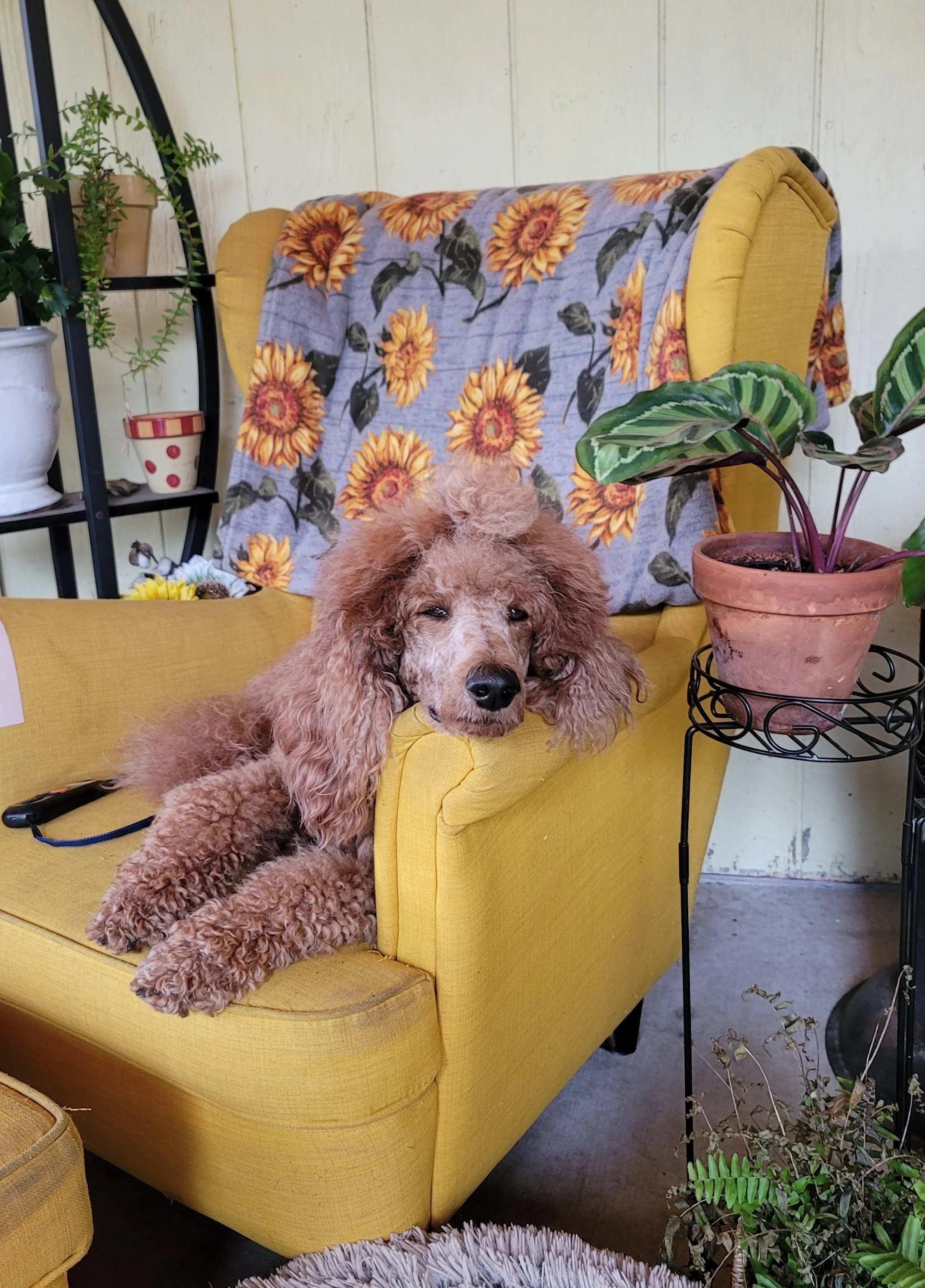 Fig is a more stout Standard Poodle, weighing in at 55 pounds. She loves being outside and would happily stay there most of the day if given the choice. Fig is fairly well behaved, but if you take your eyes off her for too long, she’ll find a mole hole and do her best to dig her way to it. She’s also quick to locate any source of water and turn it into a makeshift swim hole. Fig brings equal parts chaos and love to the farm..