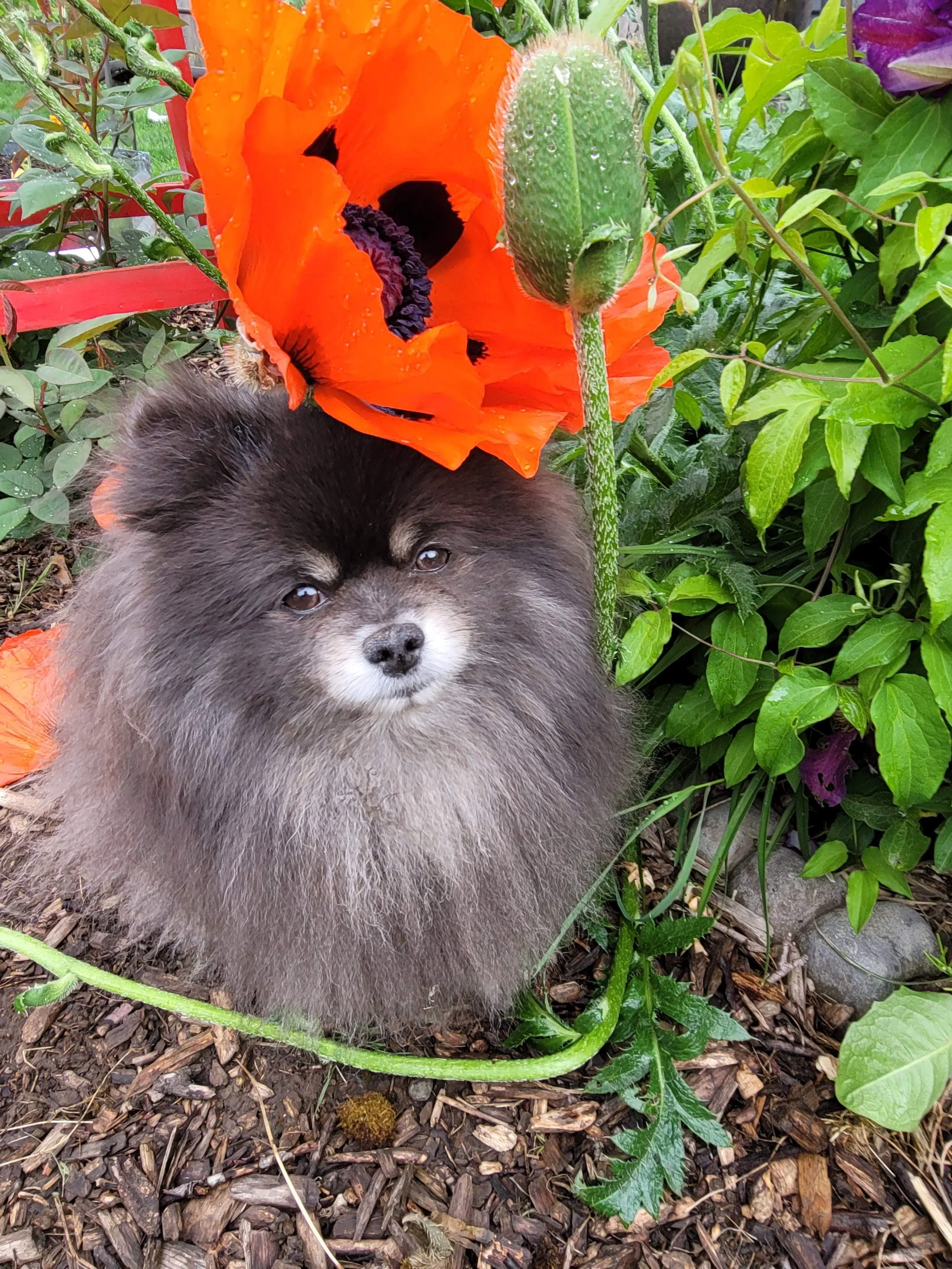 Poppy is a fiercely independent Pomeranian with an unmatched obsession with food. She can solve treat puzzles in record time and would do anything for a snack. Her time in the garden is spent in search of “rabbit pellet snacks.” Poppy is gentle with all animals and fully trusted with the chickens.